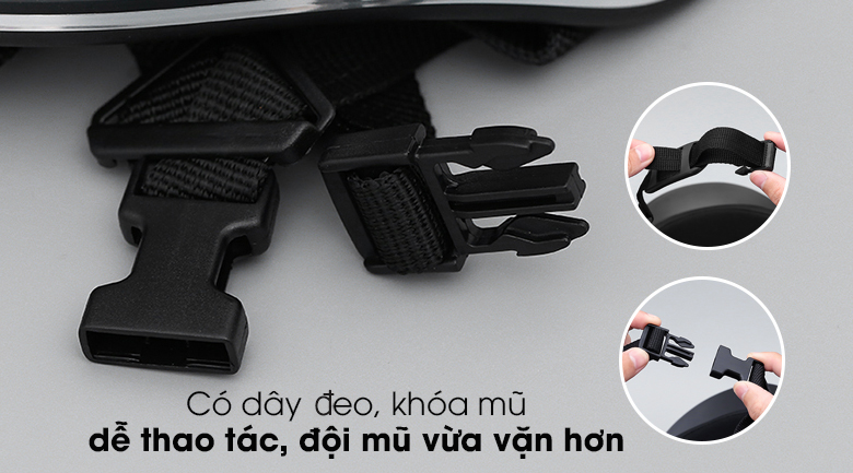 Ngoài ra còn có thiết kế khóa mũ cứng cáp, thao tác đóng mở thoải mái, đảm bảo đội mũ vừa vặn với vòng đầu của mình.