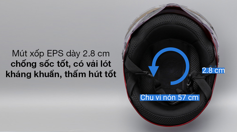 Bảo vệ vùng đầu hiệu quả khi xảy ra va chạm. Ngoài ra, phần đệm lót bên trong có lớp vải kháng khuẩn, thấm hút tốt, chống ẩm, giữ cho vùng đầu khô thoáng khi di chuyển trong thời gian dài, bảo vệ mũ khỏi mùi hôi, ẩm mốc.