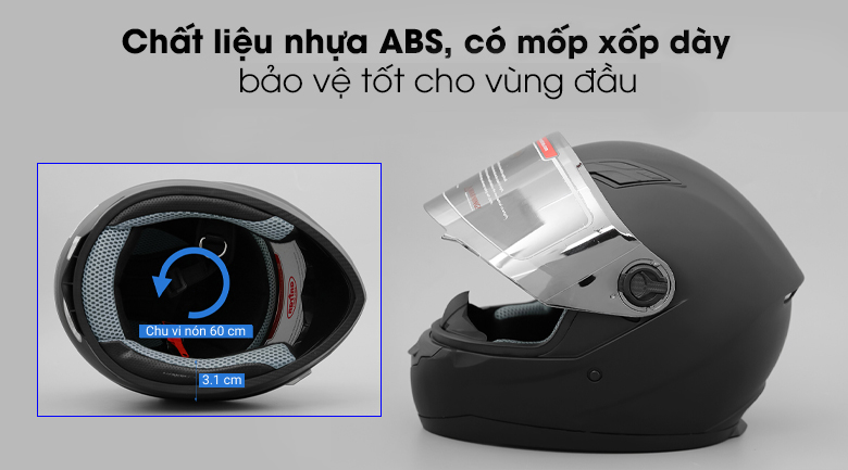 Sử dụng chất liệu nhựa ABS nguyên sinh làm vỏ mũ giúp tăng khả năng chịu lực, va đập, chống ăn mòn. Phần ruột bằng mốp xốp EPS dày 3.1 cm cố định vùng đầu, cho hiệu quả chống sốc, bảo vệ vùng đầu hiệu quả trong mọi hoàn cảnh. Bên trong mũ có lớp vải lót kháng khuẩn, chống ẩm, rất tốt cho việc bảo vệ chiếc nón khỏi mùi hôi, ẩm mốc, dễ tháo rời vệ sinh.