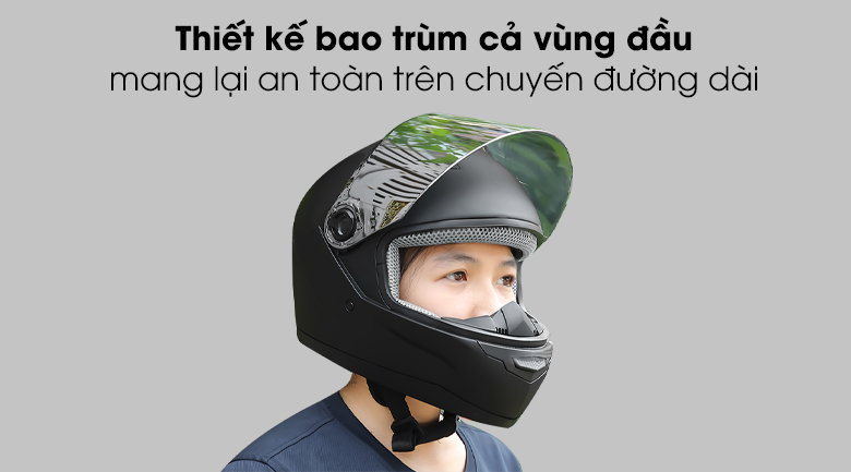 Thiết kế fullface phù hợp người có chu vi đầu từ 60 - 61 cm, bao trùm cả vùng đầu của bạn, mang lại an toàn trên mọi chuyến đi đường dài, khả năng khử ồn và va đập từ môi trường bên ngoài của loại nón này rất tốt.