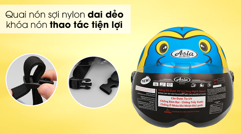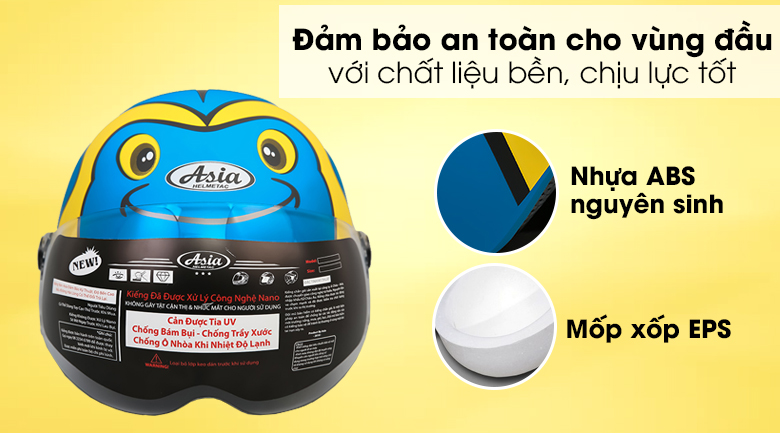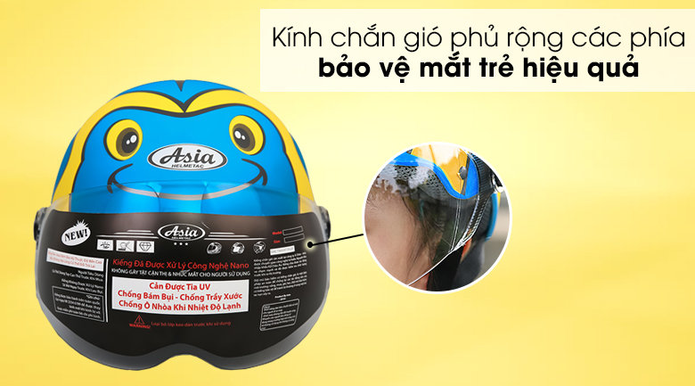 Mũ bảo hiểm trẻ em nửa đầu có kính size S Asia MT-103KS, sản phẩm của thương hiệu Asia, sản xuất tại Việt Nam năm 2018, màu sắc nổi bật, chất lượng tốt, bảo vệ vùng đầu của trẻ hiệu quả, rất thích hợp để chọn mua cho con trẻ của bạn sử dụng hằng ngày.