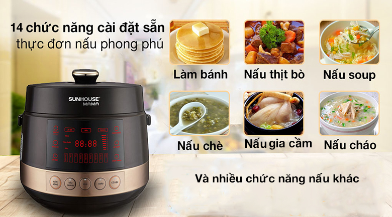 Nồi áp suất Sunhouse có 14 chức năng cài đặt sẵn: bánh, nấu chè, nấu đậu, thịt bò, gia cầm, thịt lợn, súp, cháo, nấu tiêu chuẩn, hâm nóng, nấu nhanh, hầm, nấu cháo, nấu cô đặc