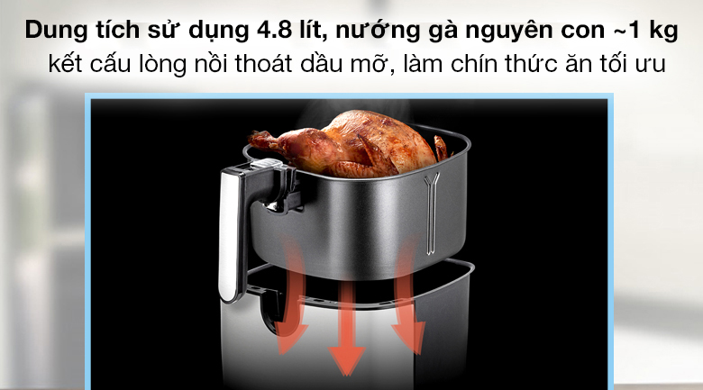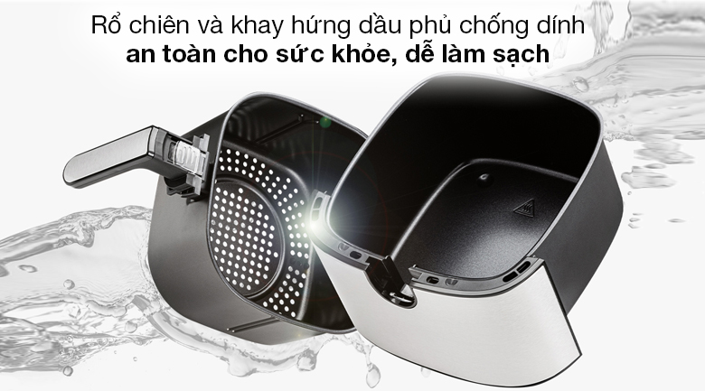 Thiết kế lòng nồi kết cấu 2 lớp gồm rổ chiên và khay hứng dầu khi đặt chồng lên nhau sẽ tạo ra 1 khoảng trống để dầu mỡ từ món ăn chảy xuống dưới, giúp món ăn được chiên rán hạn chế dầu mỡ.