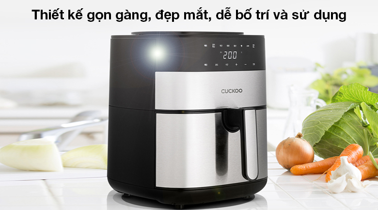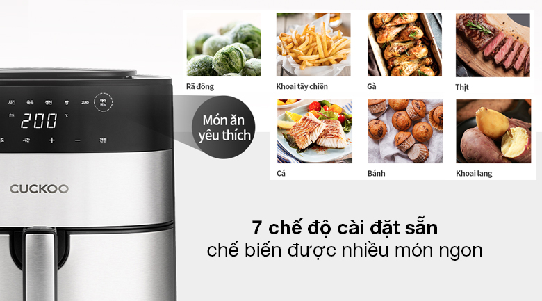 Nồi chiên không dầu Cuckoo CAF-G0510T 5.5 lít của thương hiệu Cuckoo làm chín thức ăn đều, nhanh với luồng khí xoay vòng tuần hoàn 200°C, công suất lớn 1750W, dung tích 4.8 lít, điều khiển cảm ứng hiện đại, cài đặt 7 chế độ nấu tự động giúp nấu ăn thuận tiện, lựa chọn cho mọi gia đình.