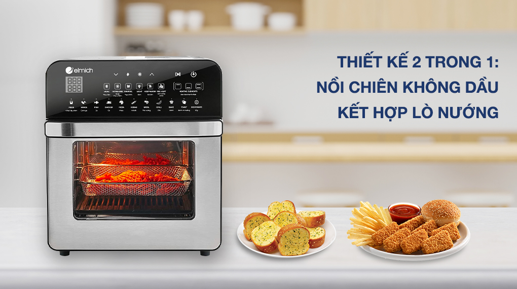 - Mẫu nồi chiên không dầu Elmich này được thiết kế 2 trong 1 - nồi chiên không dầu kết hợp lò nướng, có khoang lò rộng rãi để bạn thoải mái chiên nướng thực phẩm số lượng nhiều.