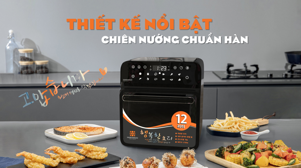 Lò chiên không dầu Hawonkoo AFH-120-BA 12 lít có thiết kế kết hợp giữa nồi chiên không dầu và lò nướng, hỗ trợ bạn chế biến thức ăn hạn chế dầu mỡ, đồng thời đem lại sự tiện nghi, vẻ đẹp hiện đại cho căn bếp gia đình.