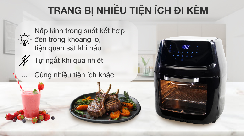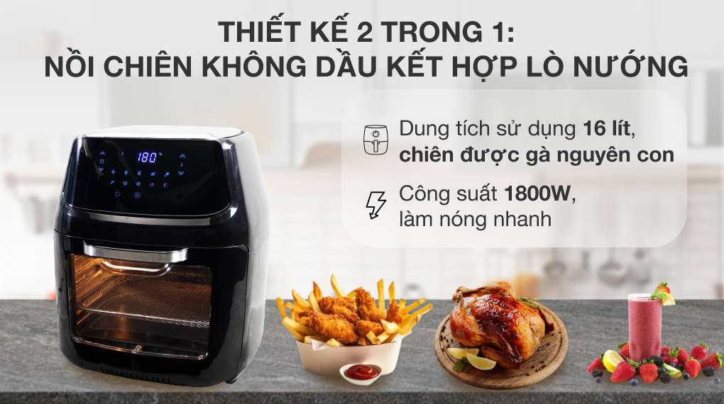 - Thiết bị là sự kết hợp giữa nồi chiên không dầu và lò nướng, khoang lò rộng cho bạn chiên nướng thoải mái.