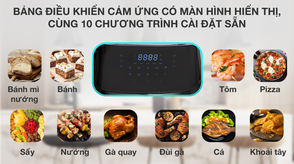 - Trang bị 10 chế độ nấu cài sẵn: sấy, khoai tây, nướng, gà quay, đùi gà, cá, tôm, pizza, bánh, bánh mì nướng, phù hợp cho cả người mới tập nấu nướng. Bạn chỉ cần chọn chức năng, lò sẽ tự động điều chỉnh nhiệt độ và thời gian thích hợp cho từng món ăn.