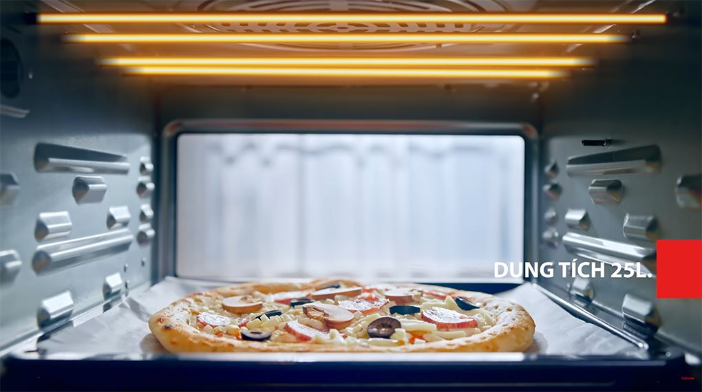 Lò chiên không dầu Toshiba có khoang chứa lớn với dung tích 25 lít, có thể chứa 6 lát bánh mì, bánh pizza 44 cm hoặc nướng gà nguyên con giúp bạn chuẩn bị bữa ăn cho gia đình nhanh chóng hơn.