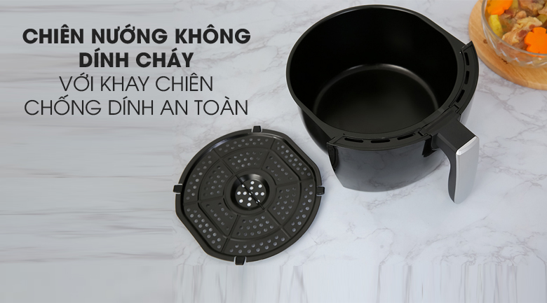 Quạt đối lưu nhanh chóng luân chuyển luồng khí nóng đều khắp khay chiên, giúp thực phẩm chín đều mà không cần trở mặt.