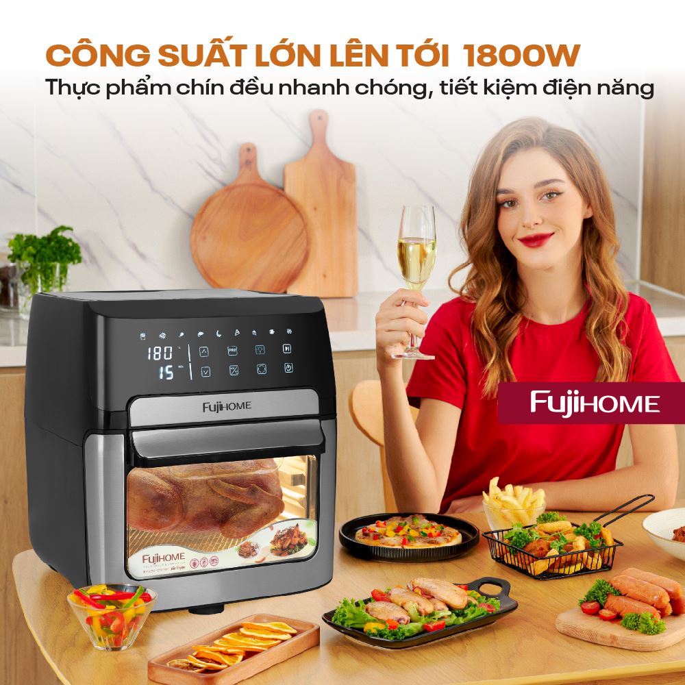 FUJIHOME A12DB sở hữu dung tích lên đến 12 lít, cho phép bạn dễ dàng chế biến lượng lớn thực phẩm chỉ trong một lần nấu, phù hợp cho cả gia đình đông người hoặc những buổi tiệc nhỏ. Với dung tích này, bạn có thể chiên nguyên con gà khoảng 1.5 kg hoặc nướng một mẻ khoai tây chiên đủ cho cả nhà thưởng thức. Thiết bị hoạt động mạnh mẽ với công suất 1800W, đảm bảo thực phẩm chín nhanh chóng, đều màu, đồng thời tiết kiệm điện năng.