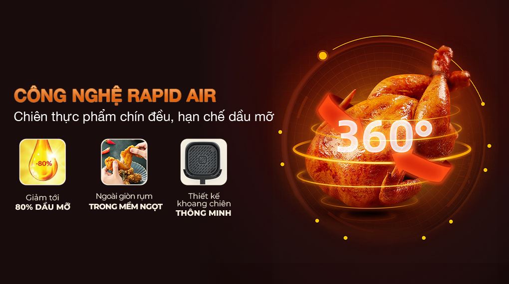 - Công nghệ Rapid Air sử dụng luồng khí nóng đối lưu 360° cho thức ăn chín đều từ mọi mặt, giảm đến 80% lượng dầu mỡ so với chiên truyền thống.