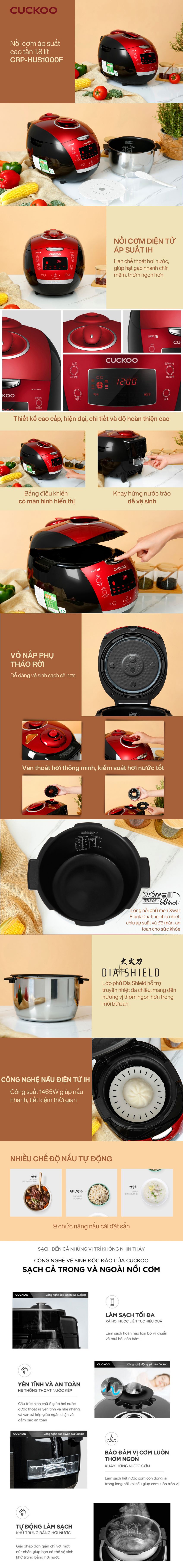 Nồi cơm áp suất cao tần Cuckoo 1.8 lít CRP-HUS1000F được sản xuất và nhập khẩu từ Hàn Quốc, sở hữu nhiều tính năng, tiện ích hiện đại nổi trội so với các sản phẩm cùng nhóm hàng, hứa hẹn mang lại cho người dùng nhiều trải nghiệm tích cực.