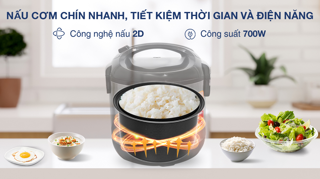 Lòng nồi bằng hợp kim nhôm phủ 2 lớp chống dính, dày 1.4 mm, giúp cơm chín đều, thơm ngon, an toàn cho sức khỏe, hạn chế dính cháy, tiện lau chùi.