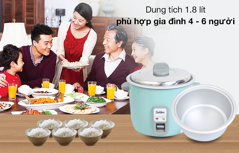 Nồi cơm điện nắp rời Delites 1.8 lít NCR1802 thiết kế nhỏ gọn, nấu cơm nhanh, dung tích lớn, thích hợp dùng cho gia đình 4 - 6 thành viên.