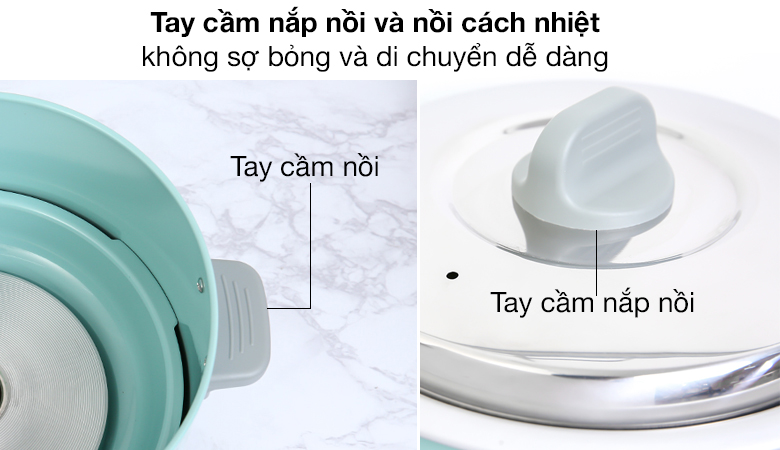 Tay cầm nắp nồi và nồi cách nhiệt, thuận tiện cầm và di chuyển nồi