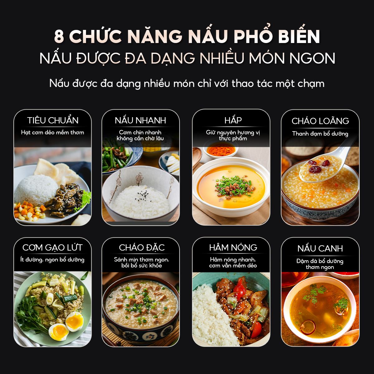 Nồi cơm điện trang bị bảng điều khiển cảm ứng hiện đại, màn hình hiển thị màu sắc rõ nét, ngôn ngữ tiếng Việt dễ sử dụng. Chỉ với một chạm, bạn có thể lựa chọn 8 chế độ nấu khác nhau: tiêu chuẩn, nấu nhanh, cơm gạo lứt, cháo đặc, cháo loãng, hấp, nấu canh, hâm nóng, tiện lợi cho nhiều nhu cầu ẩm thực.