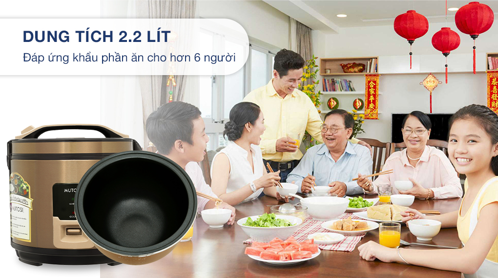 - Dung tích 2.2 lít, nấu được trên 10 cốc gạo kèm theo nồi, lựa chọn phù hợp cho gia đình có trên 6 thành viên.