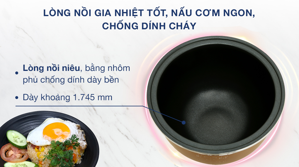 - Lòng nồi cơm điện có dạng niêu, làm từ chất liệu nhôm dày 1.745 mm truyền nhiệt tốt, giúp nấu cơm chín ngon. Lòng nồi còn tráng lớp chống dính có độ bền cao, không tiết độc tố trong quá trình nấu, hạn chế bám dính, dễ dàng vệ sinh.