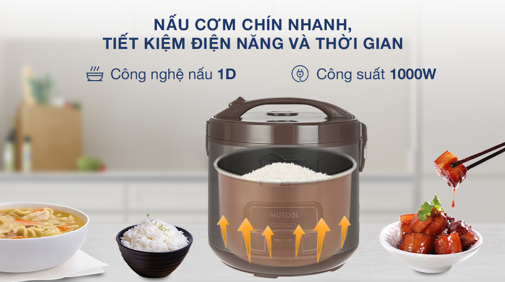 - Công suất 1000W kết hợp công nghệ nấu 1D truyền nhiệt tốt, nấu chín cơm nhanh chóng, tiết kiệm thời gian.