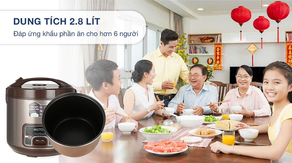 - Dung tích 2.8 lít, có thể nấu được trên 10 cốc gạo đi kèm theo nồi, đáp ứng nhu cầu sử dụng cho gia đình trên 6 người.