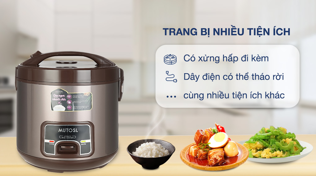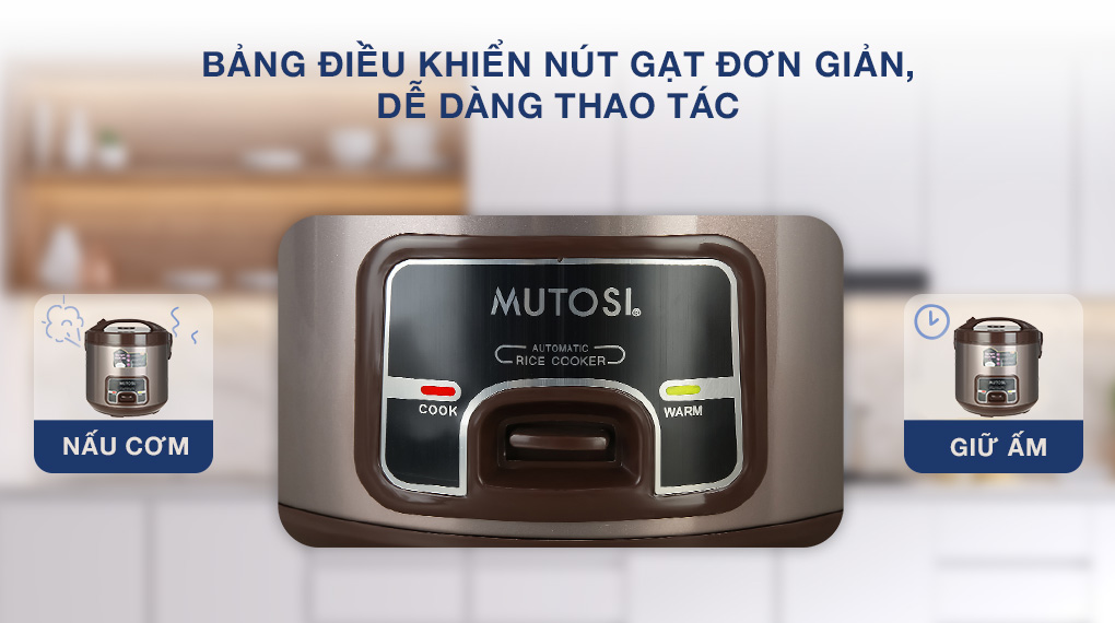- Nồi cơm điện Mutosi MR-38 có kết cấu chắc chắn, tông màu nâu trang nhã, tạo điểm nhấn cho căn bếp gia đình sang trọng, hiện đại hơn. Thiết kế tay cầm phía trên nắp nồi cứng cáp, cho bạn dễ dàng di chuyển nồi từ kệ bếp ra bàn ăn.