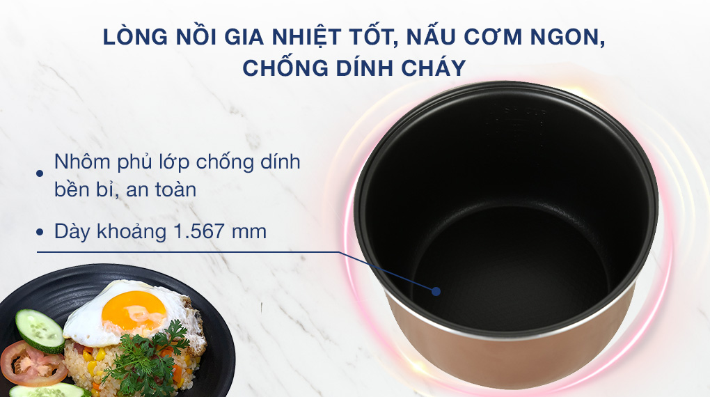 - Lòng nồi bằng nhôm dày 1.567 mm gia nhiệt tốt, nấu cơm chín ngon, nhanh, bề mặt phủ lớp chống dính bền bỉ, an toàn cho sức khỏe, dễ dàng lau chùi.