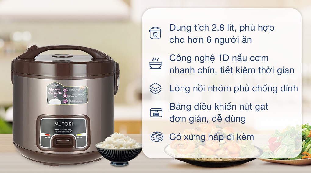 Nồi cơm nắp gài Mutosi 2.8 lít MR-38 thiết kế gọn gàng, công suất mạnh mẽ kết hợp công nghệ 1D giúp nấu cơm nhanh chín, là sự lựa chọn phù hợp cho gia đình đông người, dễ sử dụng ngay cả với người cao tuổi.