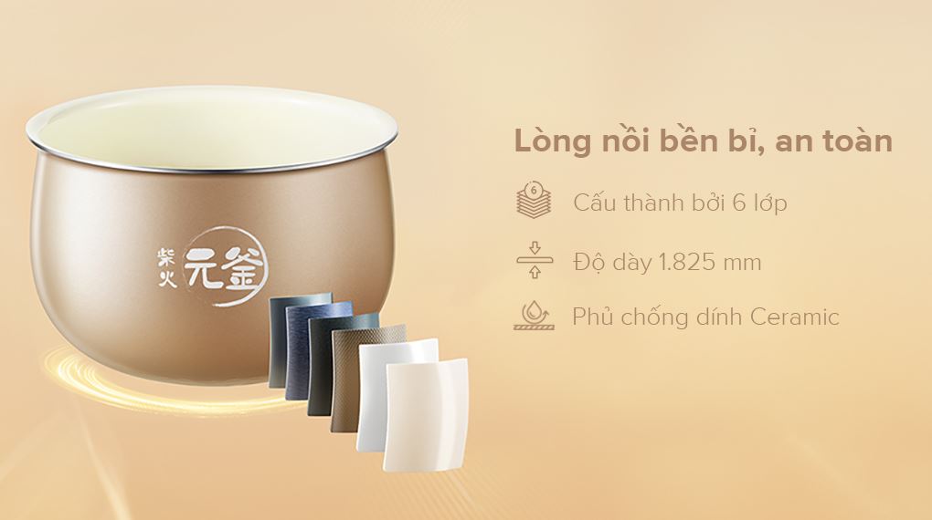 Không những vậy, lòng nồi được làm bằng hợp kim nhôm dày 1.825 mm và phủ lớp Ceramic chống dính màu trắng lạ mắt, trang nhã, hài hòa với ngoại hình của nồi.