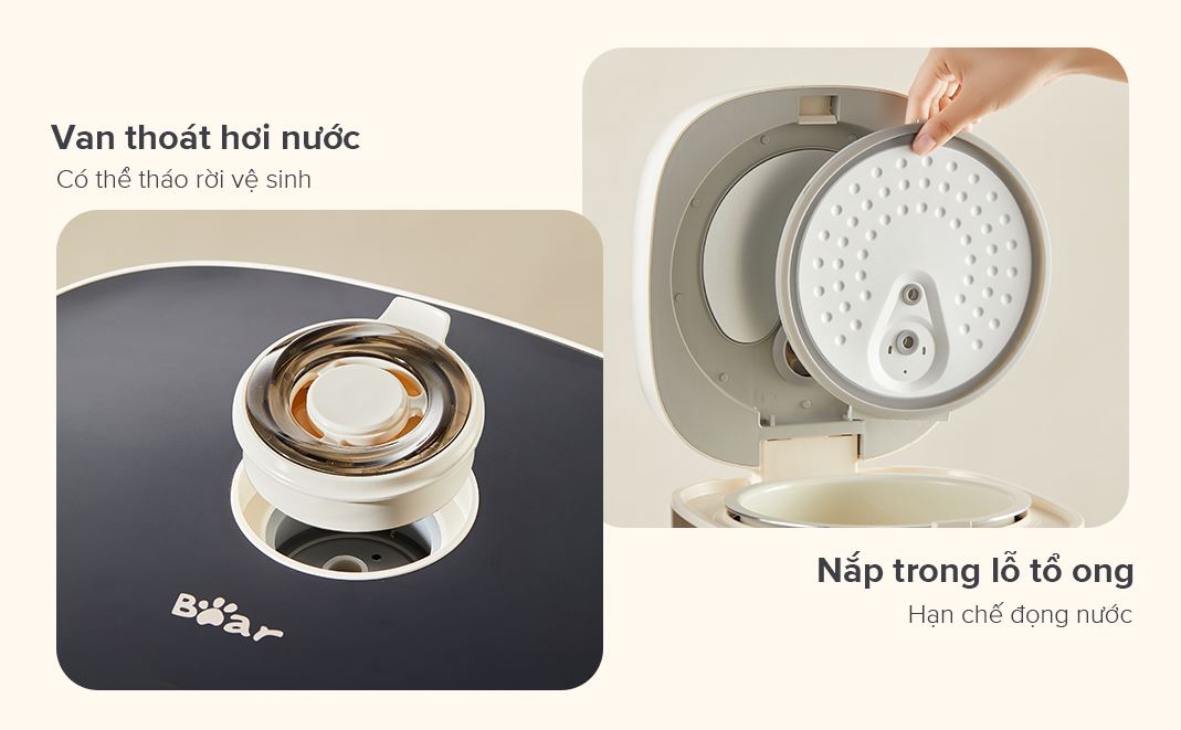 - Phần nắp trong dạng tổ ong ngăn nhỏ nước hạn chế tình trạng cơm nhão, có thể tháo rời giúp người dùng dễ dàng vệ sinh.