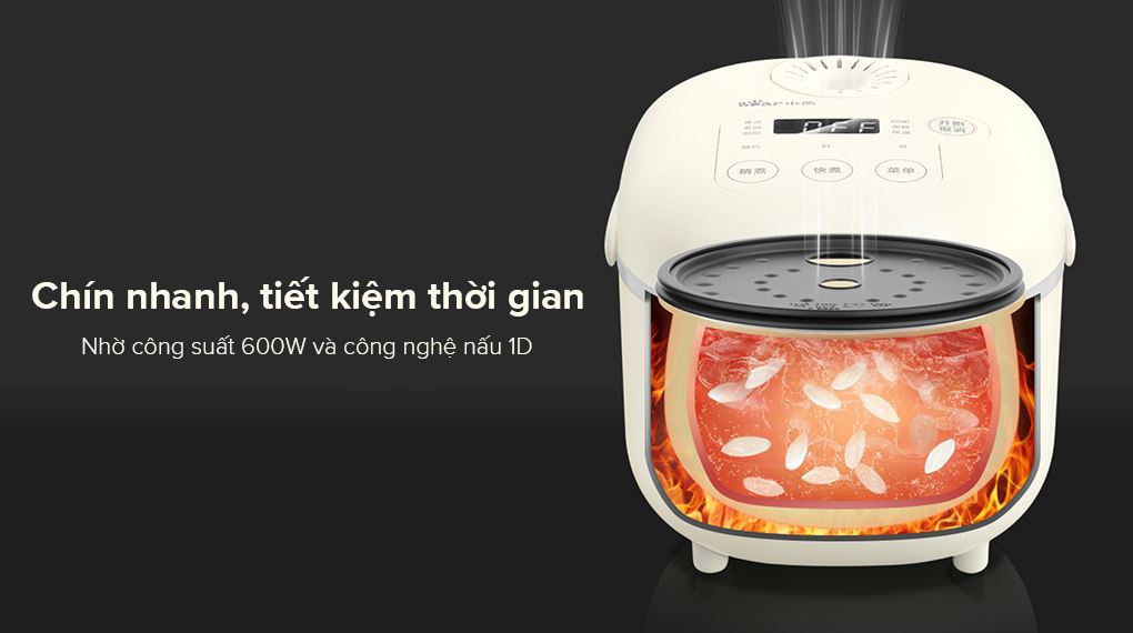 Nồi vận hành với công suất 600W kết hợp cùng công nghệ nấu 1D cho cơm chín nhanh, tiết kiệm thời gian.