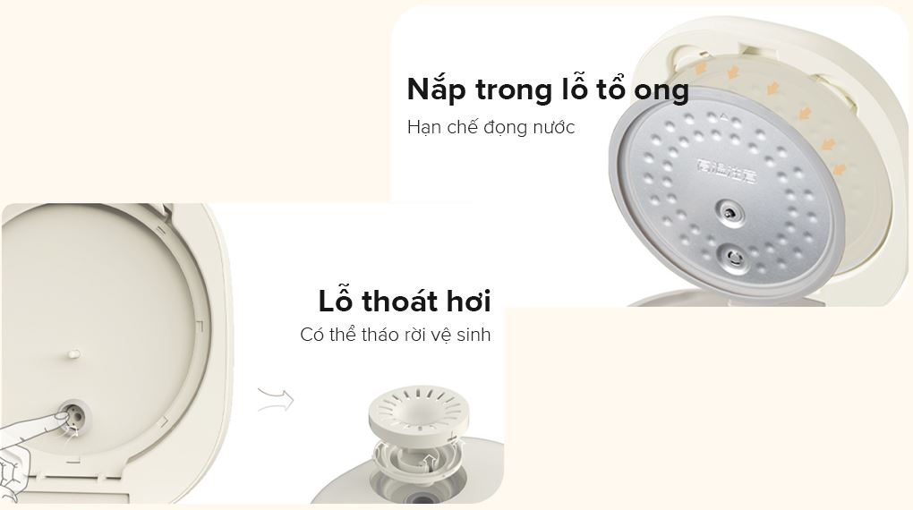 - Phần nắp trong dạng tổ ong ngăn nhỏ nước hạn chế tình trạng cơm nhão, có thể tháo rời giúp người dùng dễ dàng vệ sinh.