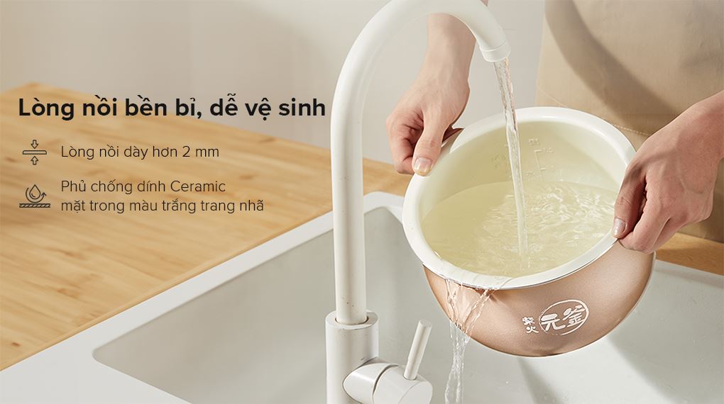 Không những vậy, lòng nồi được làm bằng hợp kim nhôm dày hơn 2 mm và phủ lớp Ceramic chống dính màu trắng lạ mắt, trang nhã, hài hòa với vẻ ngoài của nồi.
