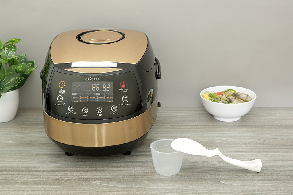 - Mẫu nồi cơm điện Crystal này được thiết kế tông màu vàng đồng sang đẹp, kết cấu vững chắc, làm tăng vẻ đẹp hiện đại cho không gian bếp.