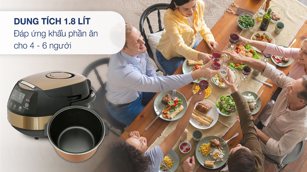 - Dung tích 1.8 lít nấu được 8 - 10 cốc gạo kèm nồi, đáp ứng tốt khẩu phần ăn cho 4 - 6 người.