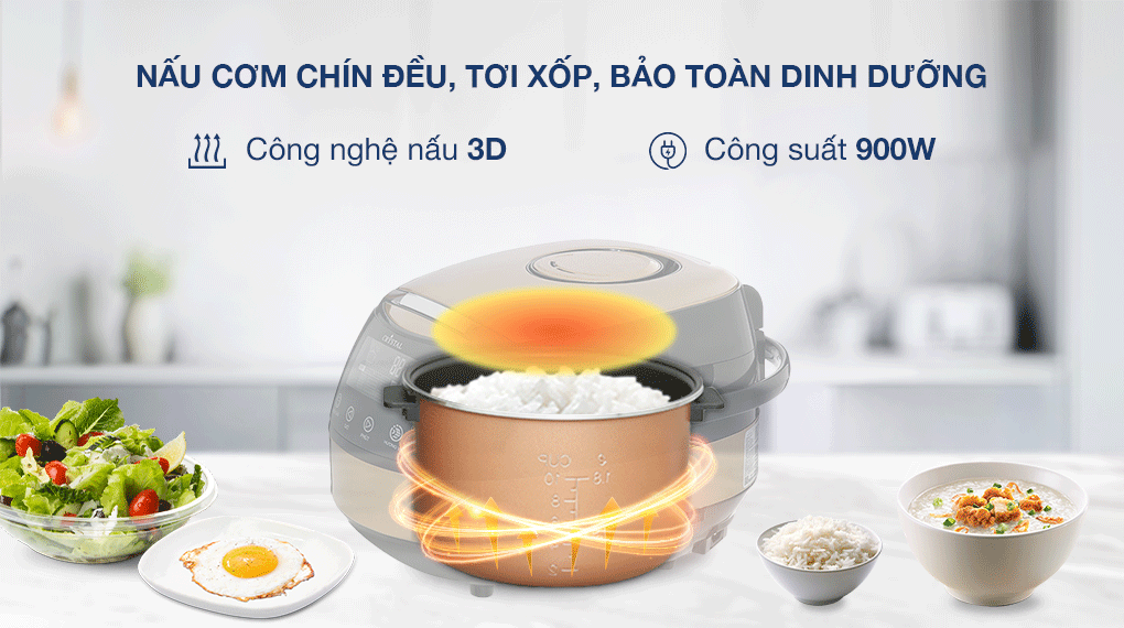 - Công suất hoạt động 900W kết hợp công nghệ nấu 3D giúp nồi nấu cơm chín đều, tơi xốp, giữ lại được dinh dưỡng trong hạt gạo.