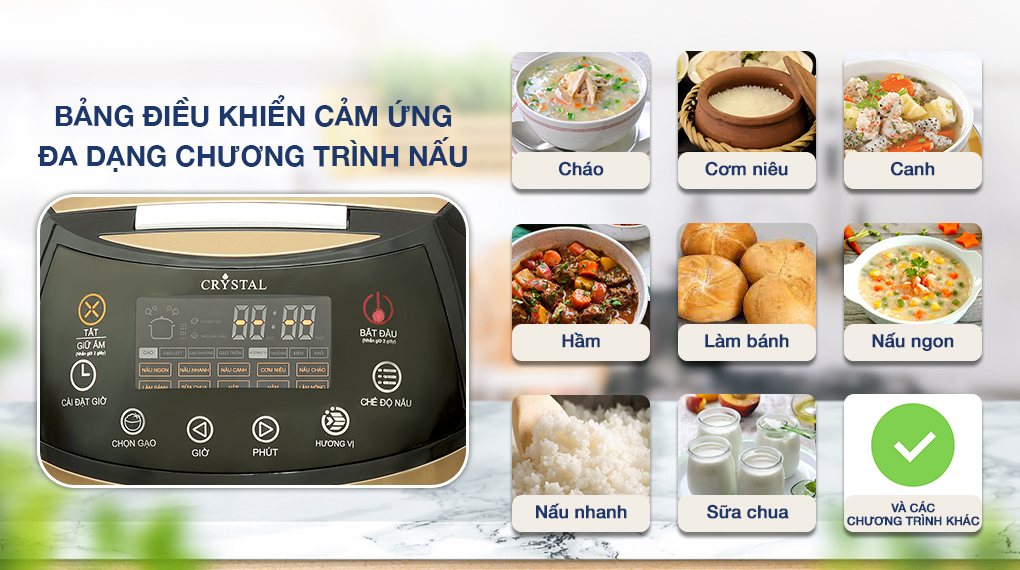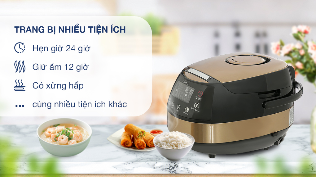 - Tích hợp đa dạng chương trình cài đặt sẵn, hỗ trợ bạn chế biến nhiều món dinh dưỡng cho gia đình: nấu ngon, nấu nhanh, nấu canh, cơm niêu, nấu cháo, làm bánh, sữa chua, hấp, hầm, làm nóng và giữ ấm.