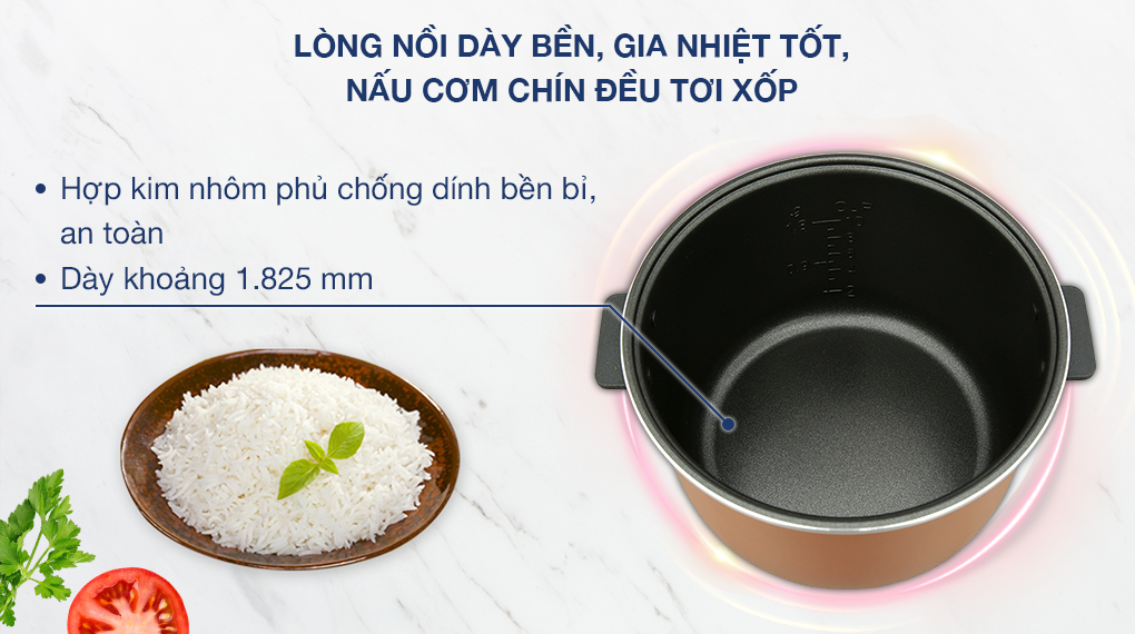 - Lòng nồi hợp kim nhôm phủ chống dính bền tốt, dày 1.825 mm, gia nhiệt tốt giúp nấu cơm chín đều, thơm ngon, giữ ấm hiệu quả, chống dính cháy và tiện vệ sinh.