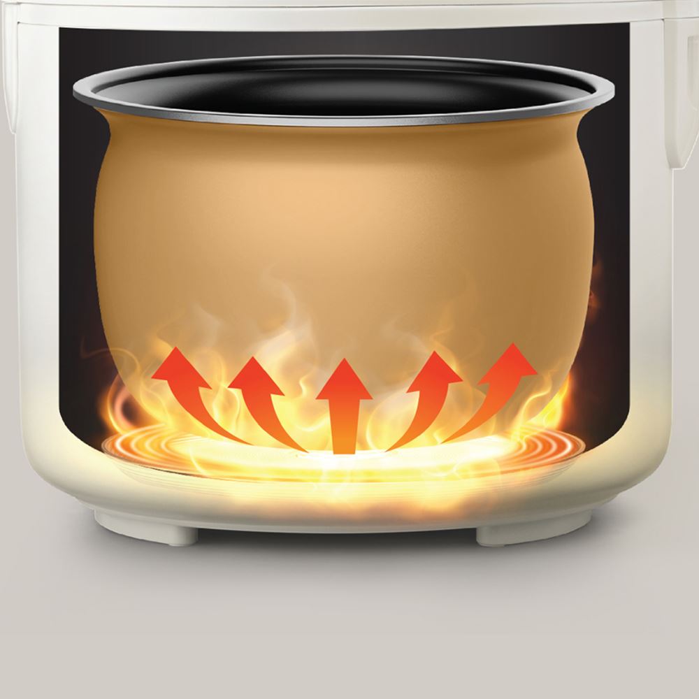 Điểm nổi bật của chiếc nồi cơm điện này chính là lòng nồi hình cầu dày dặn, được thiết kế để truyền nhiệt đều khắp, giúp hạt cơm chín tới, tơi xốp và giữ trọn hương vị. Kết hợp với mâm nhiệt chữ U, nồi giữ nhiệt tối ưu, đảm bảo cơm luôn nóng hổi và thơm ngon chuẩn vị như nhà hàng. Công nghệ nấu nhiệt 2D phân bổ nhiệt lượng một cách hiệu quả, mang lại chất lượng cơm hoàn hảo.