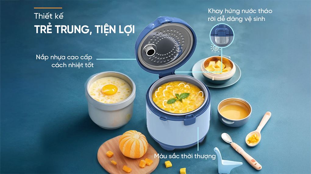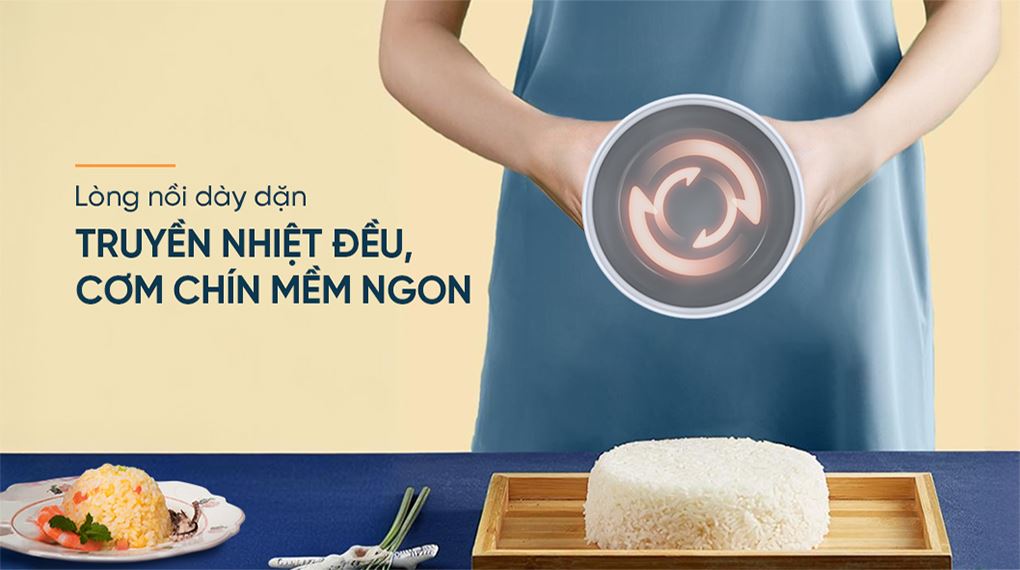 Lòng nồi cơm điện dày khoảng 1 mm kết hợp công suất 500W giúp truyền nhiệt ổn định, hỗ trợ cơm chín đều và giữ được độ tơi ngon. Thiết kế lòng nồi dày còn góp phần duy trì nhiệt lâu hơn, giúp cơm giữ độ dẻo thơm trong suốt bữa ăn.