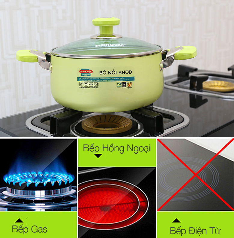 Bộ 5 nồi nhôm anod Sunhouse SH9955 sử dụng được trên bếp gas, bếp hồng ngoại, không dùng cho bếp từ.
