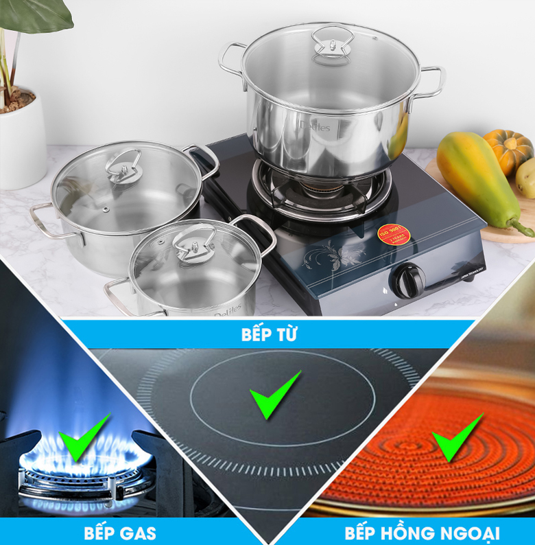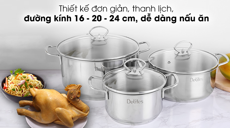 Bộ 3 nồi inox 3 đáy Delites NR001-B3 mang đến niềm tin cho khách hàng với vẻ ngoài hiện đại, chất liệu cao cấp, sang trọng, dùng được trên mọi loại bếp, thương hiệu uy tín, rất đáng sắm.
