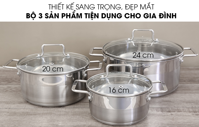 Bộ 3 nồi inox 3 đáy nắp kiếng Hommy BE005 là bộ sản phẩm cần thiết trong những gian bếp, giúp công việc nấu nướng trở nên tiện lợi hơn, hỗ trợ chế biến đa dạng món ăn cho gia đình.