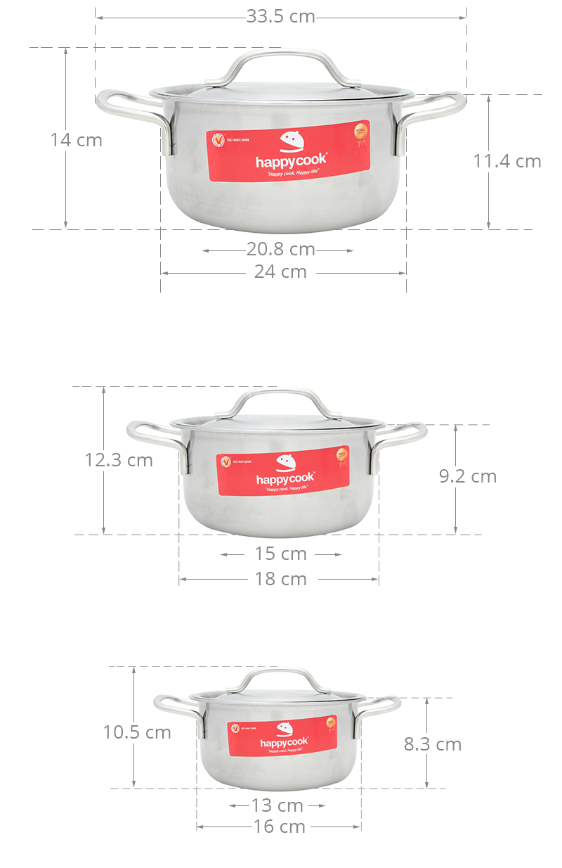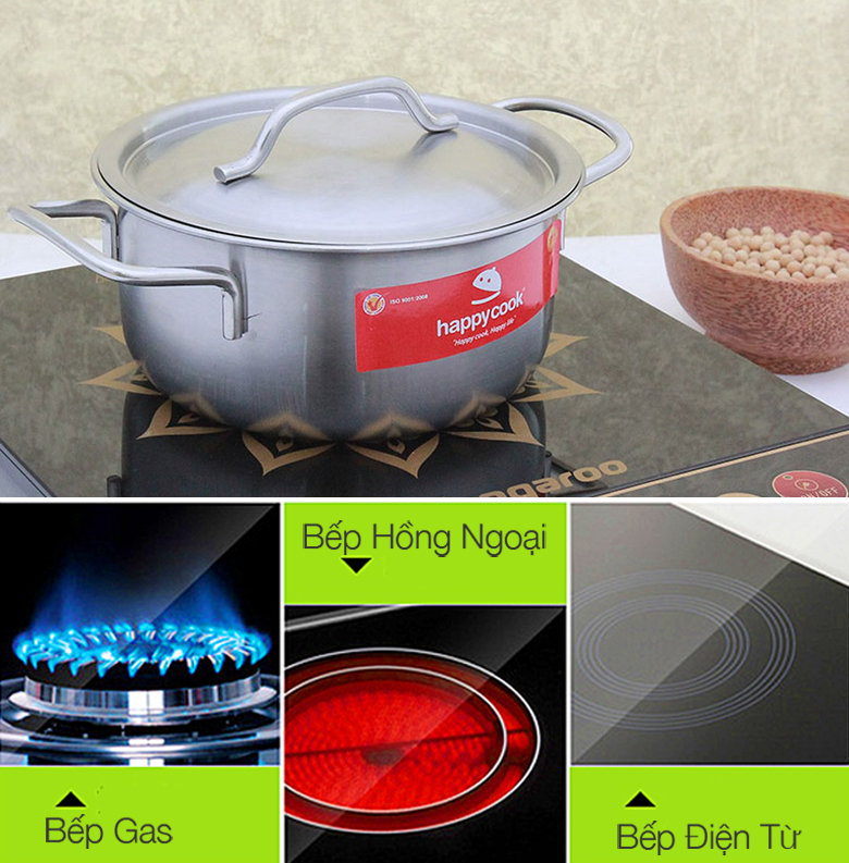 Bộ 3 nồi inox Happycook sử dụng được trên bếp từ, bếp hồng ngoại, bếp gas.