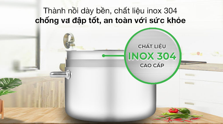 Chất liệu inox 304 cao cấp chống oxy hóa cao, chống nhiễm các chất độc hại vào thức ăn.