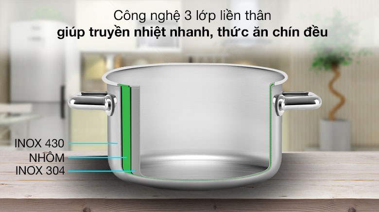 Công nghệ mới với 3 lớp liền thân: lớp inox 304 bên trong cùng, nhôm nằm chính giữa và inox 430 bên ngoài.