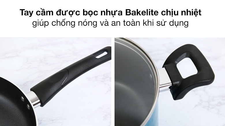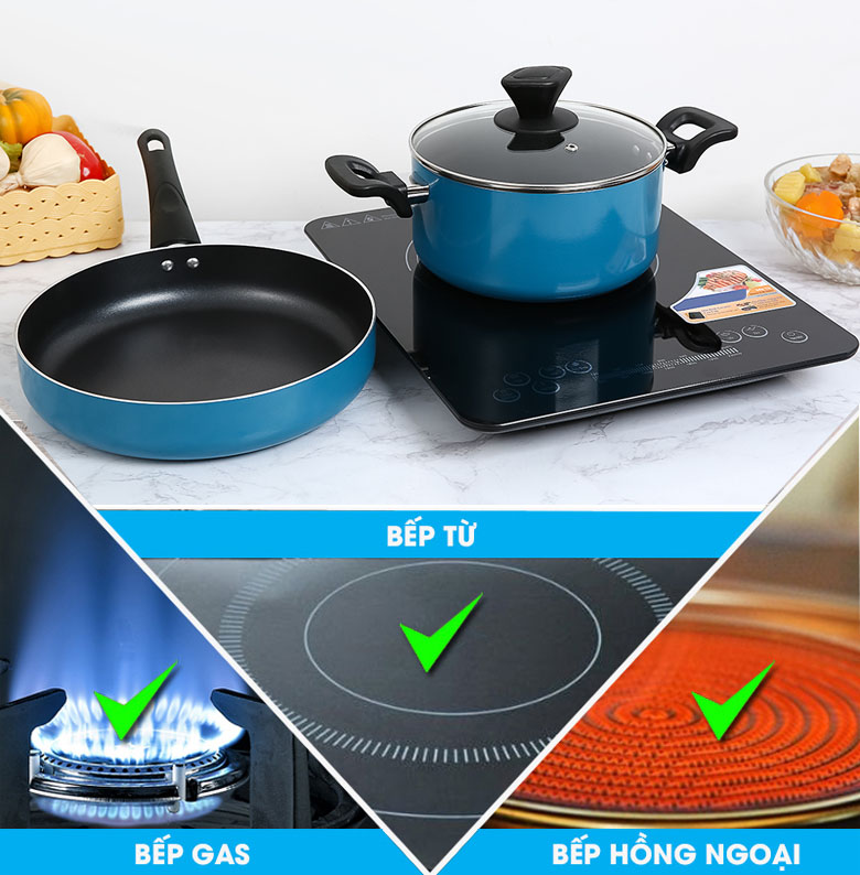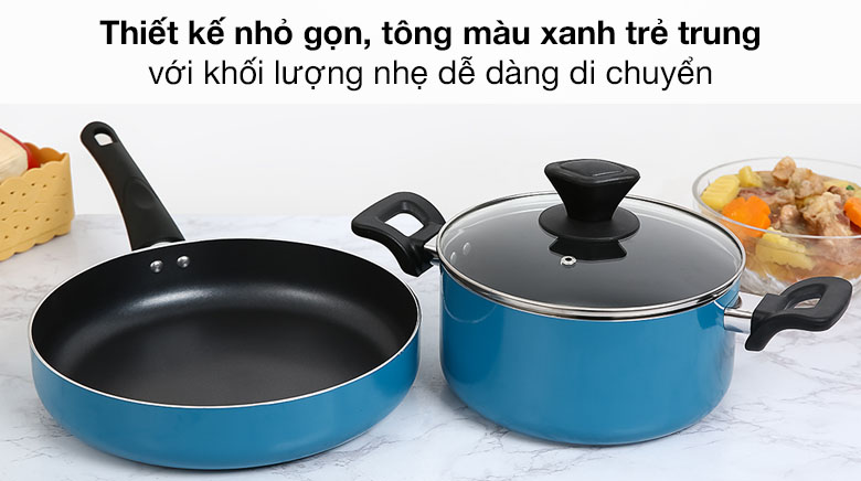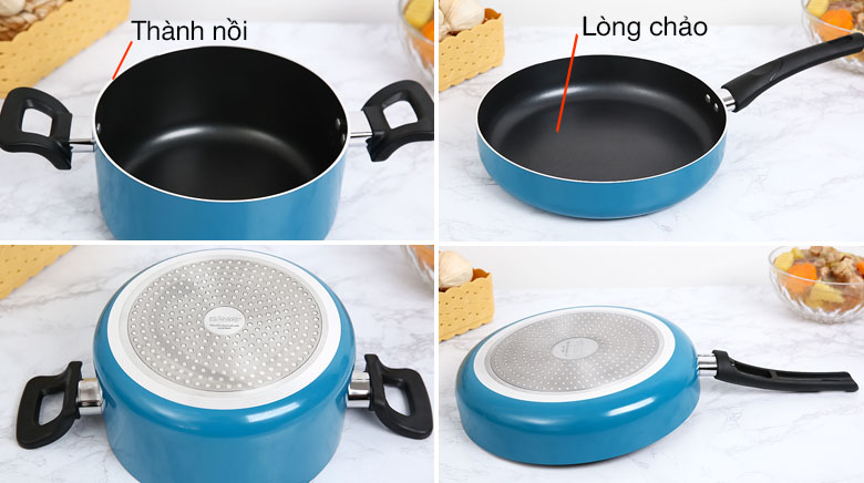 Đường kính nồi 20 cm và chảo 26 cm đáp ứng nhu cầu cho 3 - 4 người. Nồi có thể nấu cháo trẻ em hoặc thực hiện các món kho, nấu canh,... Chảo chống dính 26 cm có thể chiên được 4 cánh gà với tay cầm chắc chắn và chống nóng, an toàn khi sử dụng.