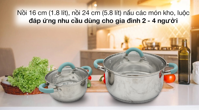 Nồi 16 cm (1.8 lít) có thể dùng nấu cháo trẻ em, nấu canh, món kho cho 1 - 2 người. Nồi 24 cm (5.8 lít) dùng nấu lẩu, luộc gà nguyên con khoảng 1.2 kg.