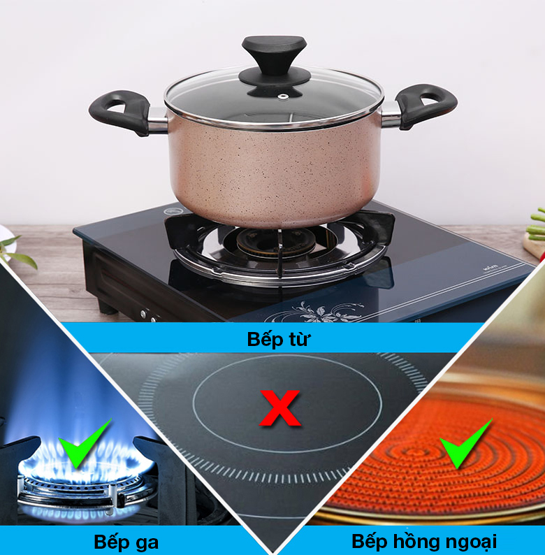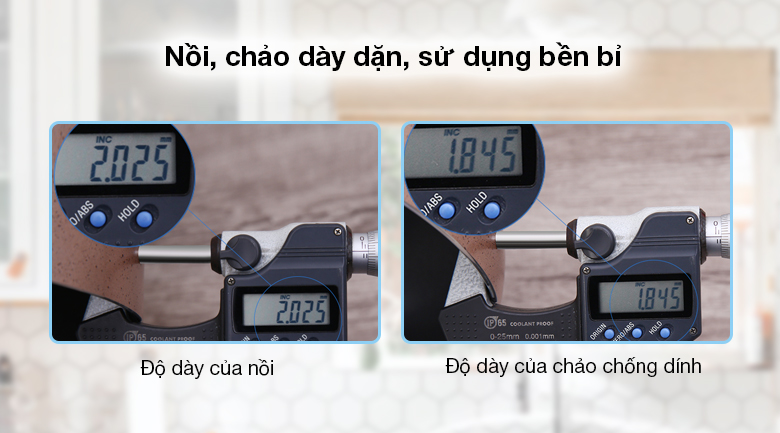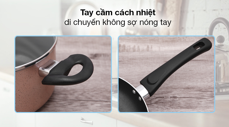 Nồi có đường kính 20 cm có thể dùng nấu canh, lẩu, món ninh hầm,... Chảo chống dính đường kính 26 cm tiện nấu các món xào, chiên, chiên được 4 cái cánh gà cùng lúc.
