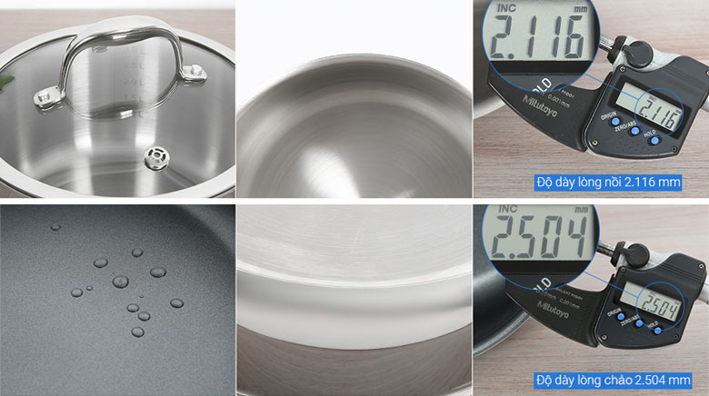 Nồi nhỏ 18 cm dùng nấu cháo trẻ em, nồi 20 cm dùng nấu các món kho, nồi trung 24 cm dùng nấu canh, nấu lẩu. Riêng chảo 26 cm có thể dùng chiên, xào tiện lợi, giúp bạn chế biến đa dạng món ăn cho gia đình.